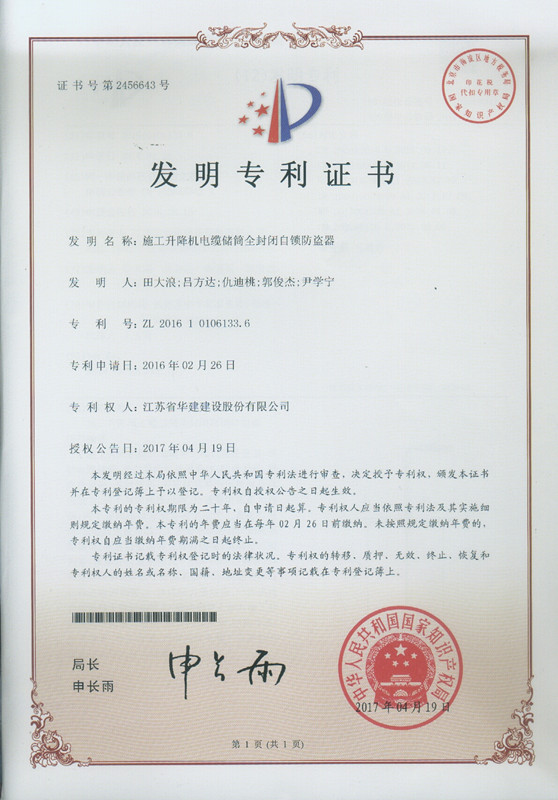 我公司又獲得一項國家發明專利授權 時間:2017-06-02 3985 日前,公司又一項發明專利獲得國家知識產權局授權,此項專利名稱為“施工升降機電纜儲筒全封閉自鎖防盜器”,專利號為ZL 2016 1 0106133.6。 至此,公司已有22項發明專利入賬。