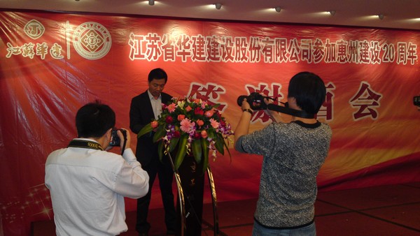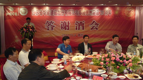 11月4日,公司在惠州凱賓斯基酒店王子飯店隆重召開參加惠州建設20周年慶典暨答謝酒會,公司副董事長、總經理宗有農主持酒會并作開場致辭。惠州市有關政府部門、部分合作方企業的負責人,華建聯盟成員單位負責人,公司董事、監事和高管等130余人出席慶典。惠州公司總經理華恒榮介紹了公司參加惠州建設20年的有關情況。惠州市工商聯主席、公司戰略合作伙伴恒宇實業集團公司董事長楊滿芳代表合作方發言,惠州市住房和城鄉規劃建設局副局長陳訓政代表政府主管部門致辭,分別對江蘇華建進駐惠州施工、參加惠州建設20周年表示祝賀。公司董事長陸金龍代表公司總部對惠州市有關政府部門、相關合作方和社會各界人士給予公司的關心和支持表示誠摯的感謝,并表達了進一步加大支持力度、加強戰略合作、加快科學發展的意愿。