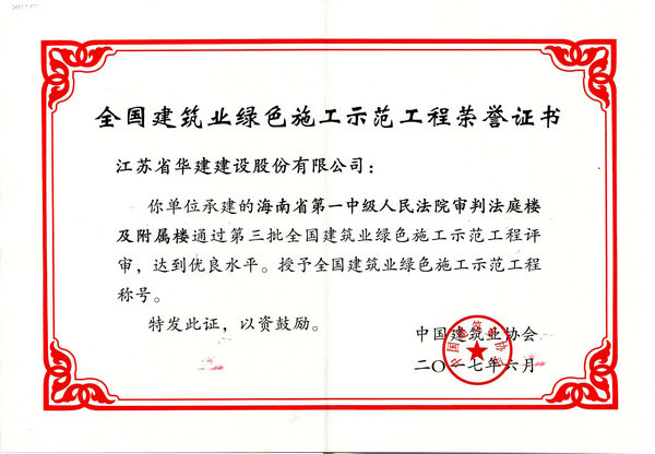6月28-29日,中國建筑業(yè)協(xié)會綠色建造與施工分會在山東省濟(jì)南市舉辦全國建筑業(yè)綠色施工創(chuàng)新發(fā)展經(jīng)驗(yàn)交流會,對經(jīng)竣工評審合格的工程頒發(fā)全國建筑業(yè)綠色施工示范工程證書。由海南公司承建的“海南省第一中級人民法院審判法庭樓及附屬樓”項(xiàng)目首次榮獲第三批“全國建筑業(yè)綠色施工示范工程”稱號。