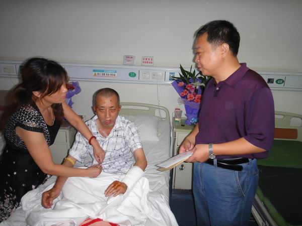 713上午,江蘇華建副總經理、宜昌市揚州商會會長王宏、宜昌分公司總經理呂進、第一工程處主任唐生健等一行,前往市二醫院看望香格里拉小區保安——英雄付永喜,并給他送去了慰問金。