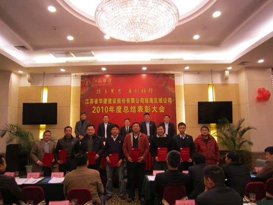 2011115下午,江蘇華建珠海區域公司在珠海市銀都大酒店召開了2010年度總結表彰大會。江蘇華建副總經理、總工程師程杰同志代表公司總部出席了總結表彰會,珠海、中山、陽江三個分公司的機關全體人員、各工程處、公司直管項目部主要管理人員及先進個人代表共108人了參加了會議。