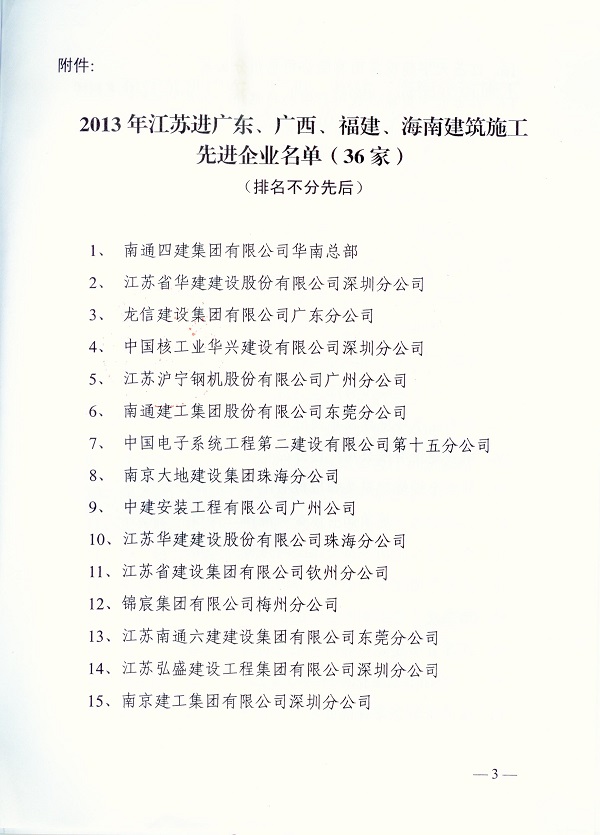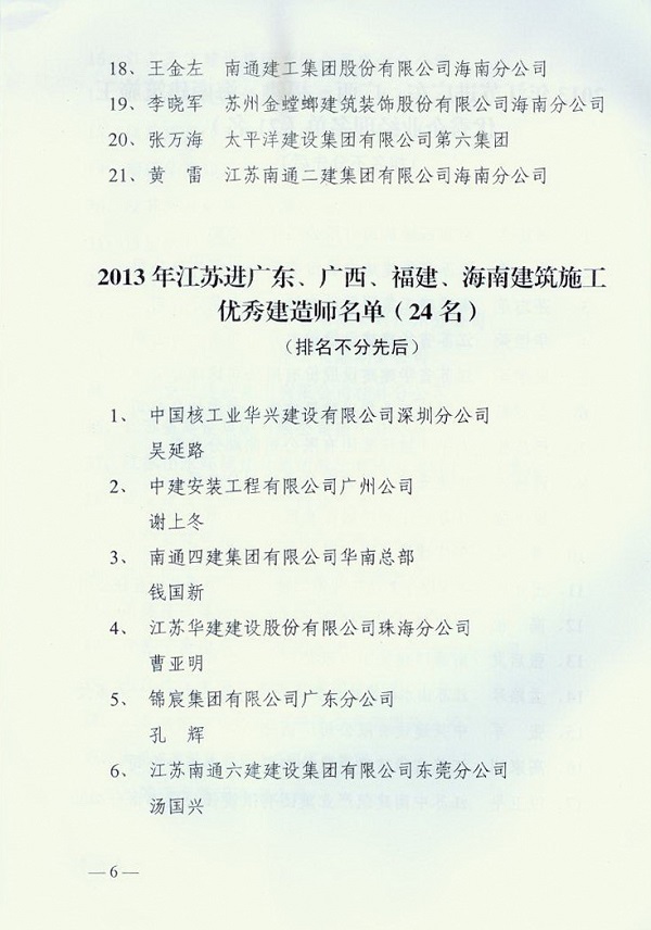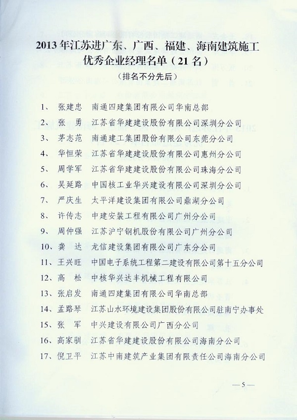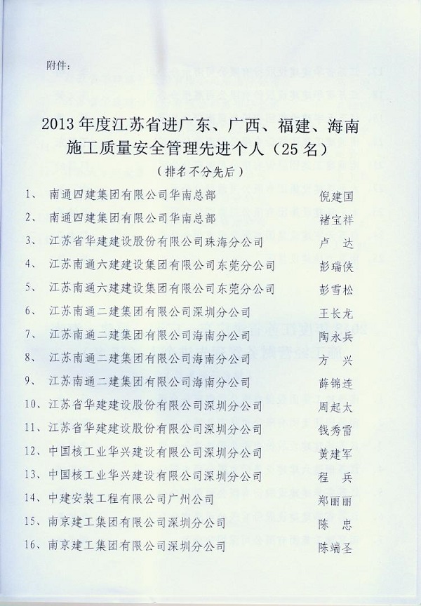 2013年江蘇進粵、桂、閩、瓊建筑施工先進企業、優秀企業經理、優秀建造師及經營財務管理、質量安全管理先進個人