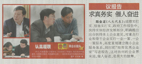 元月7日的《揚州日報》焦點新聞欄目報道了我公司董事長陸金龍參加揚州市七屆人大二次會議的有關...