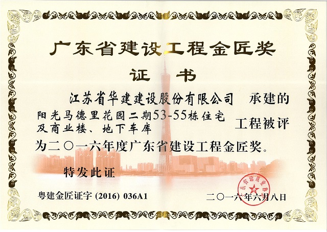 2016年度陽光馬德里53-55棟建設(shè)工程廣東省優(yōu)質(zhì)獎(jiǎng)