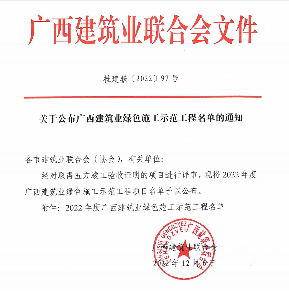近日,從廣西建筑業(yè)聯(lián)合會(huì)傳來(lái)喜訊,由北京公司總包承建的楊柳郡柳園1#、2#、3#、4#樓及地下室項(xiàng)目和楊柳郡柳園5#、6#、7#及地下室項(xiàng)目榮獲“2022年度廣西建筑業(yè)綠色施工示范工程”光榮稱號(hào)。