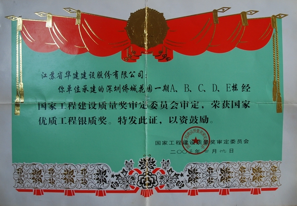 該工程先后榮獲2000年度深圳市雙優文明工程稱號(A、B、C棟工程)、2001年度深圳市雙優文明工程稱號(D、E棟工程);2003年度江蘇省揚州市“瓊花杯”及江蘇省省外“揚子杯”優質工程獎(A、B、C棟工程)、2004年度江蘇省揚州市“瓊花杯”及江蘇省省外“揚子杯”優質工程獎(D、E棟工程);2004年度國家優質工程銀獎;QC小組課題“墻體清水混凝土質量控制”獲得江蘇省一等獎及全國工程建設優秀QC小組獎。