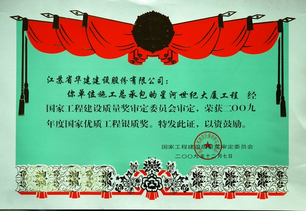 星河世紀大廈 時間:2010-01-19 8524 該工程位于深圳市福田區深南大道南與彩田路西交匯處,是深圳市中心區東門標志性建筑。該工程一裙三塔,32-39層,高173.2米,總建筑面積156680平方米,是集辦公、商業、住宅為一體的綜合樓。 該工程先后榮獲2006年度“深圳市安全生產文明施工優良工地”、2007年度深圳市優質工程“金牛獎”第一名、2007年度廣東省優良樣板工程獎、2007年度江蘇省“揚子杯”省外優質工程獎,2009年12月被評為2009年度國家優質工程銀質獎。