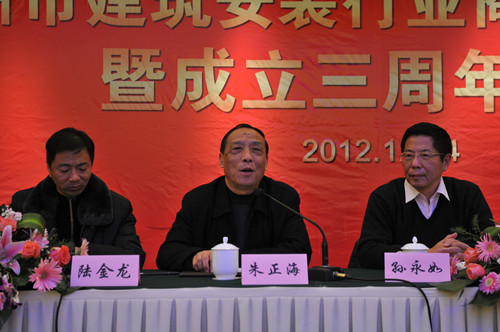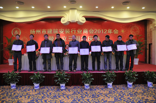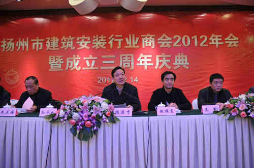12月14日下午,揚(yáng)州市建筑安裝行業(yè)商會(huì)在揚(yáng)州西園飯店舉辦2012年會(huì)暨成立三周年慶典大會(huì),市人大副主任、市工商聯(lián)主席、市總商會(huì)會(huì)長孫永如,市政府副市長聞道才,市政協(xié)原副主席、市建安商會(huì)名譽(yù)會(huì)長朱正海,市工商聯(lián)黨組書記、副主席、市總商會(huì)副會(huì)長趙振東,市工商聯(lián)副主席吳鈞等領(lǐng)導(dǎo)出席,市城建局、民政局、工商聯(lián)相關(guān)部門負(fù)責(zé)人,相關(guān)兄弟商會(huì)、協(xié)會(huì)負(fù)責(zé)人以及建安商會(huì)所有會(huì)員單位負(fù)責(zé)人等近120人參加會(huì)議,市建安商會(huì)會(huì)長陸金龍主持。