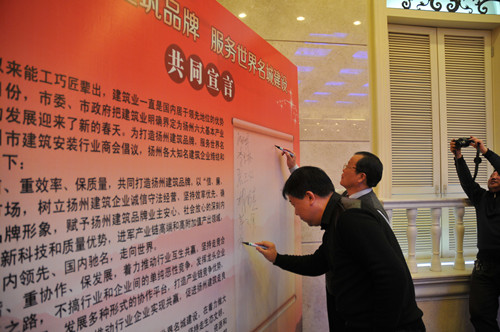 建安商會(huì)常務(wù)副會(huì)長吳士茂代表商會(huì)理事會(huì)作工作報(bào)告,秘書長戴壯民介紹了華建聯(lián)盟成立一年來的運(yùn)行情況,主席臺上的各位領(lǐng)導(dǎo)為10個(gè)新進(jìn)會(huì)員代表頒發(fā)證書。副會(huì)長曹德榮宣讀了市建安商會(huì)《打造“揚(yáng)州建筑”品牌,服務(wù)世界名城建設(shè)共同宣言》,然后所有會(huì)長單位負(fù)責(zé)人一起上臺簽署《共同宣言》,表達(dá)了共同打造揚(yáng)州建筑品牌、抱團(tuán)包容發(fā)展、擔(dān)當(dāng)建設(shè)秀美揚(yáng)州生力軍的共同愿望。