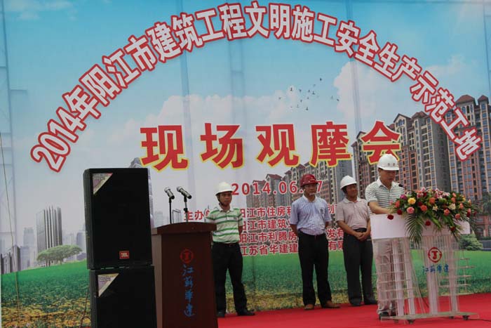 6月17日上午,“2014年陽江市建筑工程文明施工安全生產示范工地現場觀摩會”,在我公司第一項目部施工的陽光馬德里二期工程項目現場舉行。陽江市建設局副局長馮成富、質量安全監督站站長林子歡、書記何聲海和各縣(市、區)住建局安全生產分管負責人、安監站站長以及所有施工、監理單位負責人、安全管理人員近300人參加觀摩會。