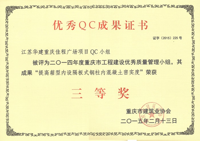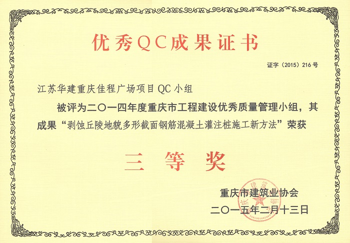 公司3項QC成果榮獲重慶市三等獎 時間:2015-04-02 4706 近日,重慶市建筑業協會發文表彰了一批優秀QC成果,公司重慶佳程廣場項目QC小組被評為2014年度重慶市工程建設優秀質量管理小組,其成果“提高箱型內設隔板式鋼柱內混凝土密實度”、“剝蝕丘陵地貌多形截面鋼筋混凝土灌注樁施工新方法”、“重慶佳程廣場基礎工程大體積混凝土裂縫成因分析和預控”等均榮獲三等獎。