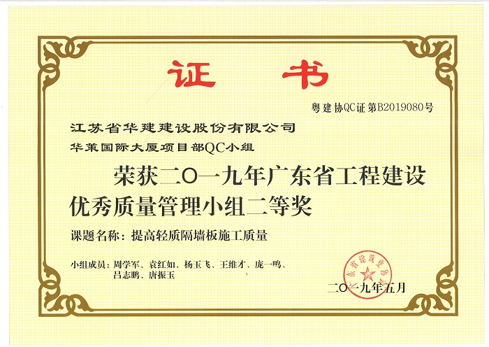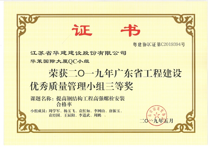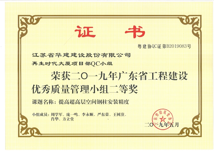 公司新添4項省級工程建設優秀QC成果 時間:2019-07-11 3758 近期,廣東省建筑業協會發文公布了2019年度廣東省工程建設優秀質量管理小組名單,公司華策國際大廈項目部QC小組“提高輕質隔墻板施工質量”、再生時代項目部QC小組“提高超高層空間鋼柱安裝精度”兩項成果喜獲二等獎,華策國際大廈項目部QC小組“提高鋼結構工程高強螺栓安裝合格率”榮獲三等獎。 華策國際大廈項目部QC小組“設備機房減振降噪的創新方法”成果在江蘇省建筑業協會組織的2019年度江蘇省工程建設質量管理小組活動中榮獲二等獎。